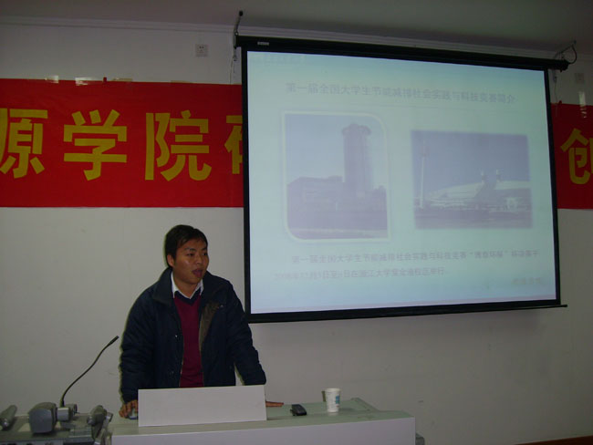 随后参赛队员代表万懿对决赛的具体情况进行了回顾,为大家介绍了部分其它高校的获奖作品,并传达了第二届全国老员工节能减排社会实践与科技竞赛的通知精神,对有志于参加今后节能比赛的同学们奠定了良好的基础。