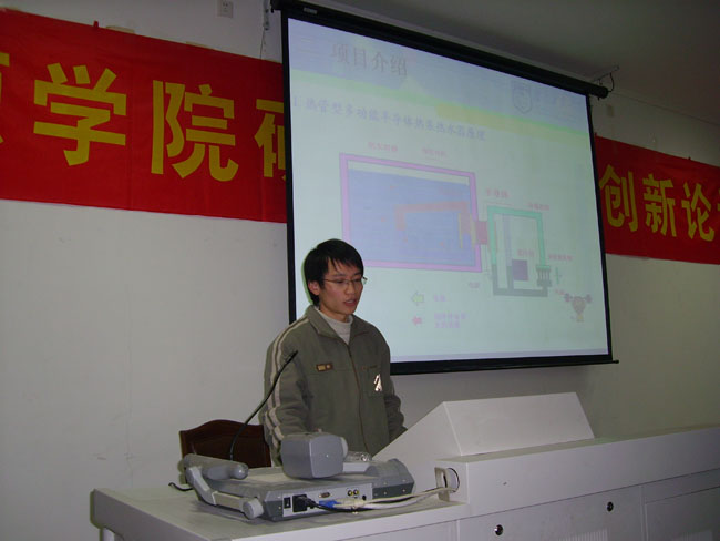 接着二等奖作品《热管型多功能半导体热泵热水器》的设计者代表龙志强详细介绍了热管型多功能半导体热泵热水器的研究过程和使用价值,并对今后的市场前景进行了展望。